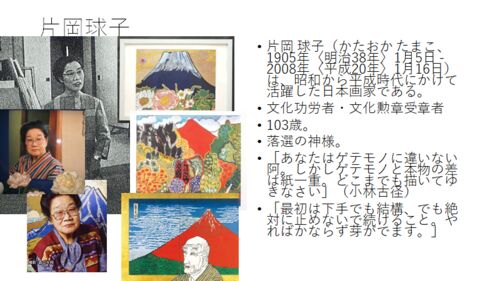 ユーチューブ『遅咲き偉人伝』 19人目は日本画家の「片岡球子」編。 https://www.youtube.com/watch?v=fc3rHs-kNoM 「最初は下手でも結構。でも絶対に止めないで続けること。やれば必ず芽が出ます。」 103歳という長寿の画家・片岡球子は1月16日に天寿を全う…